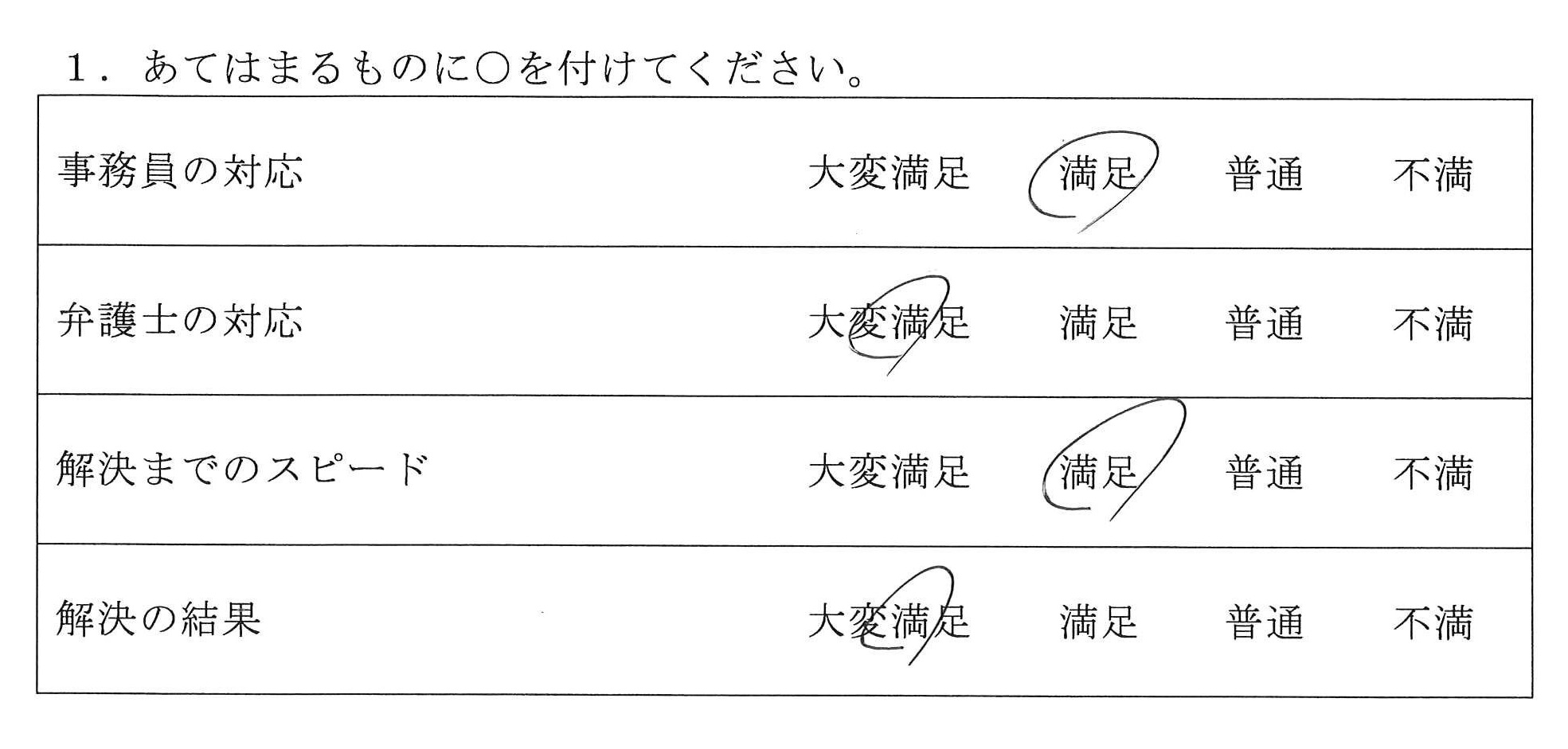 名古屋市 名古屋駅 愛知県 岐阜県 三重県 愛知県春日井市 ご依頼者様の声一覧 名古屋市50代男性(任意整理)の依頼者様の声 事務員の対応:満足 弁護士の対応:大変満足 解決までのスピード:満足 解決の結果:大変満足 尾張旭市50代男性(建物明渡)の依頼者様の声 事務員の対応:満足 弁護士の対応:満足 解決までのスピード:満足 解決の結果:満足 愛知県安城市40代男性(法人破産・特定調停)の依頼者様の声 私自身の知識不足な所を、親切に教えて対応して下さった所に大変満足しております。ありがとうございます。 岐阜県美濃市20代女性(任意整理)の依頼者様の声 事務員の対応:大変満足 弁護士の対応:大変満足 解決までのスピード:大変満足 解決の結果:大変満足 岐阜県可児市50代男性(不貞慰謝料請求)の依頼者様の声 事務員の対応:大変満足 弁護士の対応:大変満足 解決までのスピード:大変満足 解決の結果:満足 京都市40代男性(相続放棄)の依頼者様の声 事務員の対応:大変満足 弁護士の対応:大変満足 解決までのスピード:大変満足 解決の結果:大変満足 川崎市30代女性(相続放棄)の依頼者様の声 事務員の対応:満足 弁護士の対応:大変満足 解決までのスピード:普通 解決の結果:満足 一宮市40代男性(離婚)の依頼者様の声 この度は大変お世話になり、ありがとうございました。 愛知県清須市40代男性(相続放棄)の依頼者様の声 初めての法律事務所への相談、依頼であったが、とても分かり易く説明して頂き、スムーズに解決まで進むことができ有難うございました。 名古屋市50代女性(相続放棄)の依頼者様の声 事務員の対応:大変満足 弁護士の対応:大変満足 解決までのスピード:大変満足 解決の結果:大変満足 1 2 3 … 50 次へ »